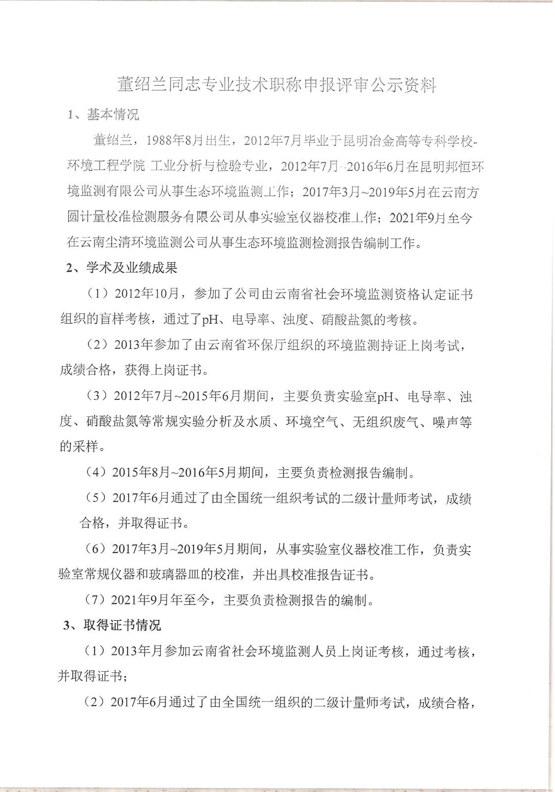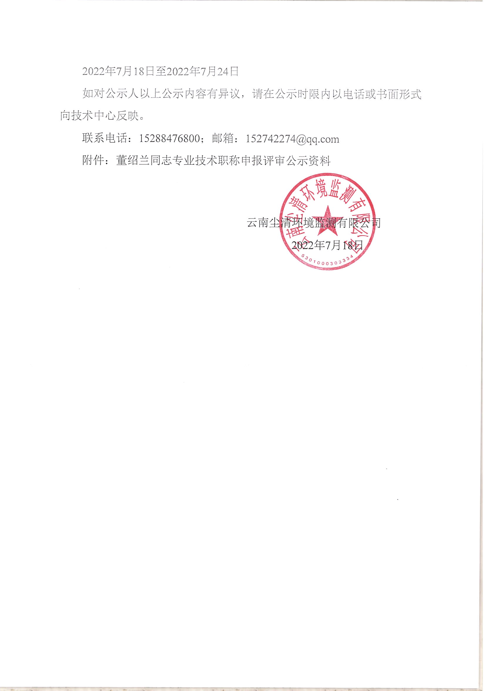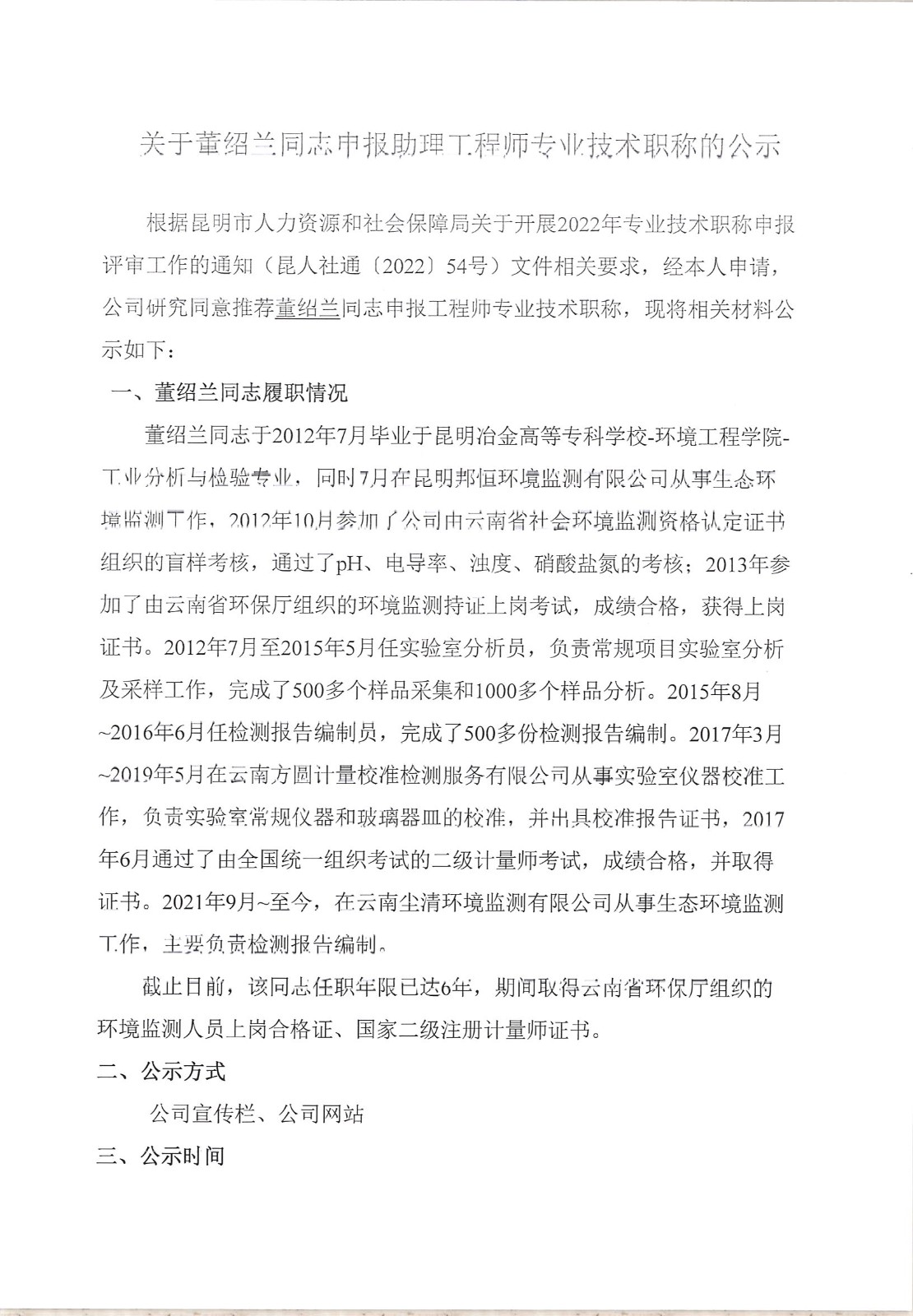 關于董紹蘭同志申報助理工程師專業技術職稱的公示(公示時間:2022年7月18日至7月24日)