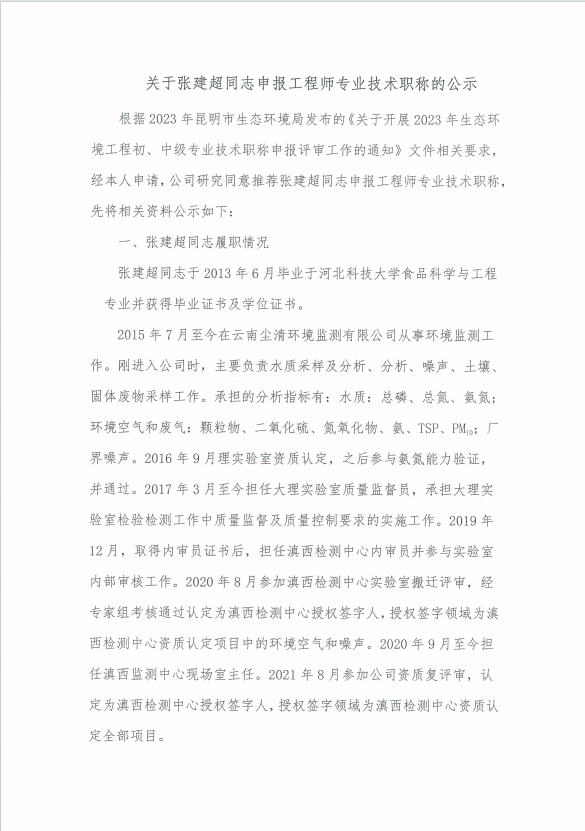 關(guān)于張建超同志申報工程師專業(yè)技術(shù)職稱的公示